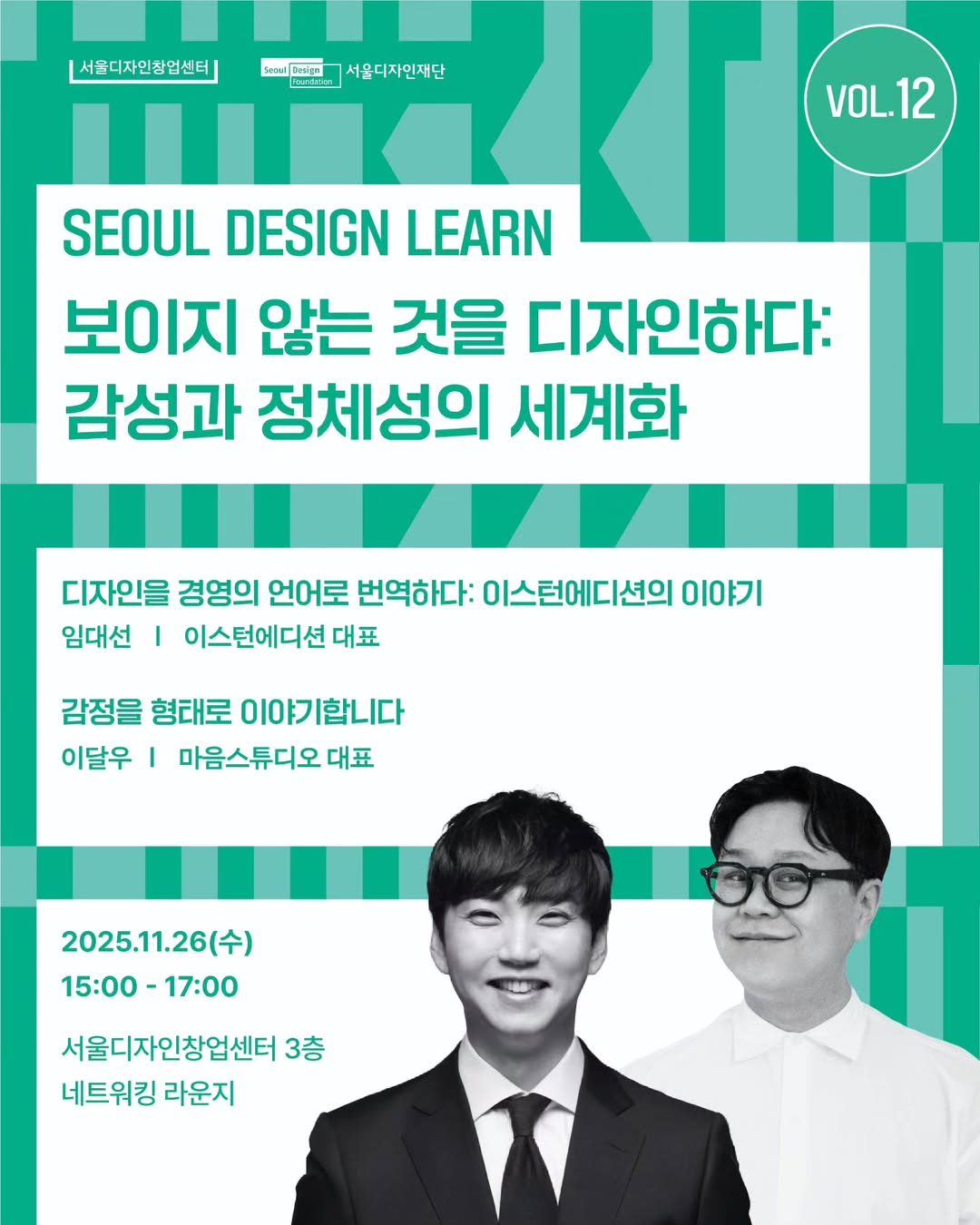 다가오는 11월 26일, 열두 번째 서울디자인런이 여러분을 찾아옵니다. 2025년의 마지막 회차인 이번 세션은 〈보이지 않는 것을 디자인하다: 감성과 정체성의 세계화〉를 주제로 이스턴에디션 임대선 대표, 마음스튜디오 이달우 대표가 함께할 예정이에요. 올해 12회차에 걸쳐 실전 밀착형 인사이트를 전해왔던 서울디자인런을 마지막으로 만날 수 있는 기회! 여러분의 참여를 기다립니다. 🔎✨