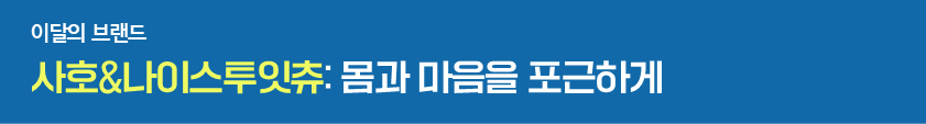 사호는 1인 가구를 비롯해 집에서 머무는 시간을 풍요롭게 만들고 싶은 모두를 위한 리빙 브랜드예요. 쿠션과 패브릭 소품을 통해 따뜻하고 아늑한 일상 공간을 제안하고 있죠. 나이스투잇츄는 티백 기반의 음료 브랜드로, 원물 블렌딩으로 만든 따뜻한 차 한 잔이 겨울철 몸과 마음을 녹여주는 여유를 선물합니다. 겨울이 깊어지는 지금, 두 브랜드가 전하는 온기와 포근함을 느껴보세요.☕️