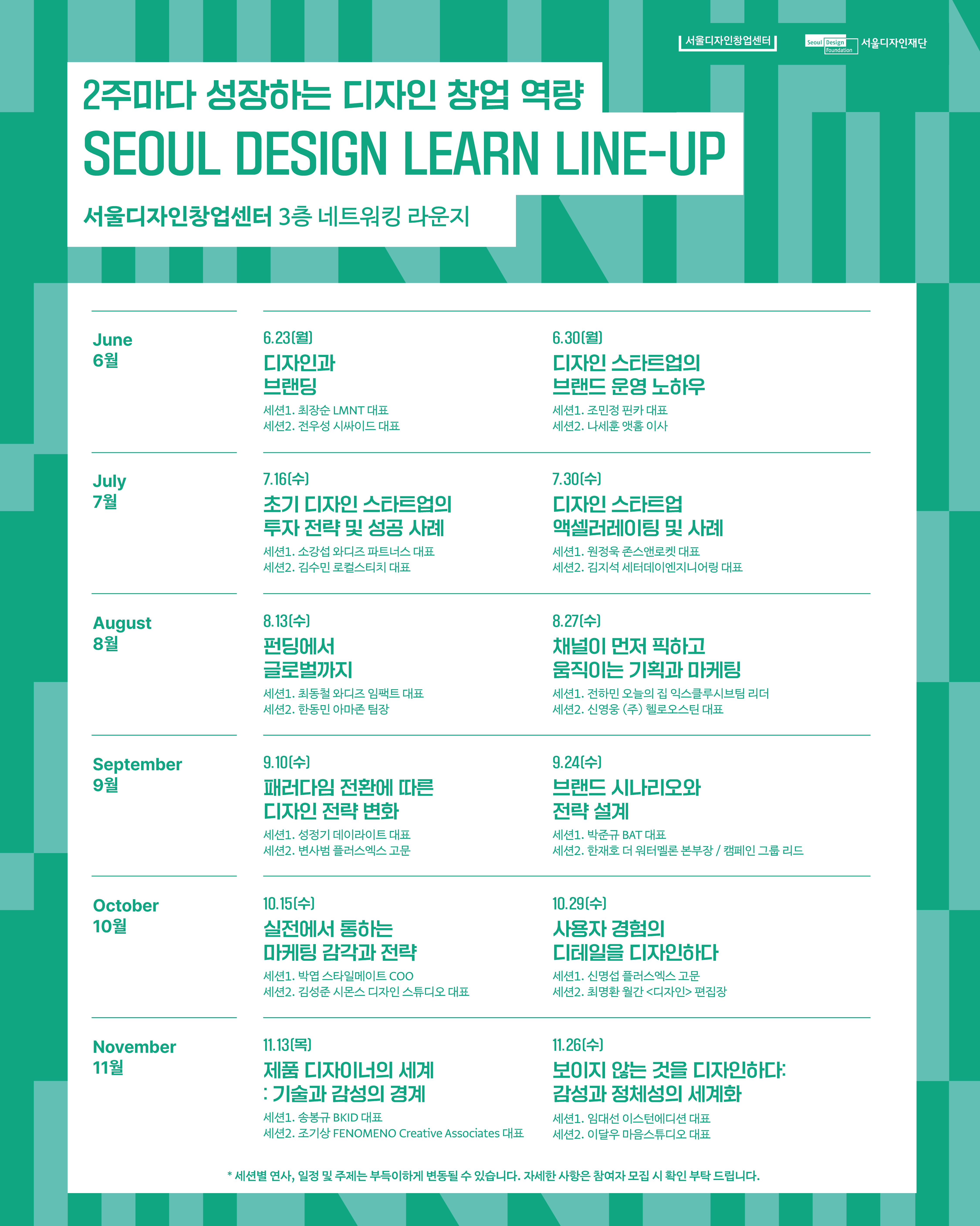 서울디자인창업센터는 디자인 실무 역량 강화와 스타트업의 비즈니스 성장을 지원하기 위해 격주로 ‘서울디자인런(SEOUL DESIGN LEARN)’ 세미나&워크숍을 운영하고 있어요.